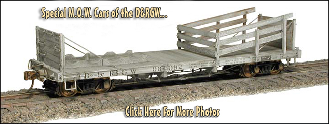 We imported three of the most often photographed M.O.W. "Flats" used on "the Grande", in two different color / paint schemes to represent the two most popular modeling eras. Click Here or on the photo to see them. |