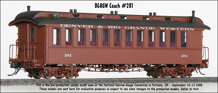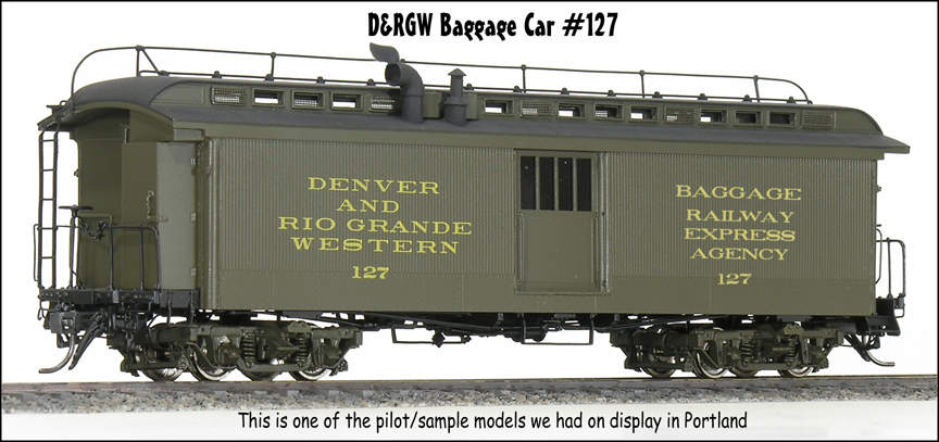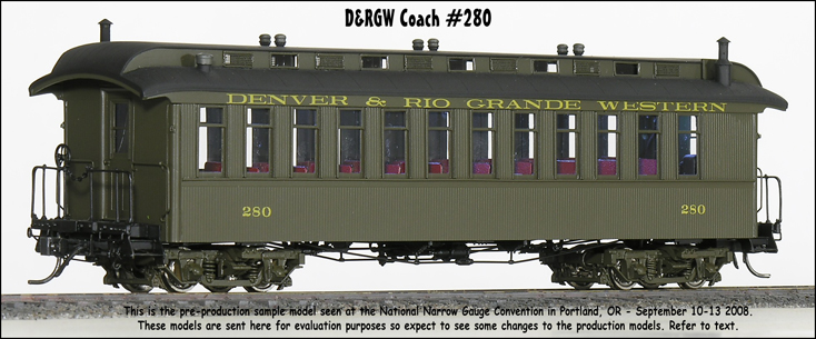 The painted models seen on this page are all PILOT / SAMPLE MODELS representative of the models in the production run. Some of these sample models had corrections yet to be applied. Many of these corrections are chronicled in the "Slide Shows" of the individual sample cars. Car Interiors have all the seating seen in the prototype, and we even modeled the great looking "filigree" appearance of their cast iron sides! We've outfitted each car with proper Coal Stoves and Bathroom Partitions completed with Fixtures too! And of course, the Coaches and Combines have non-flickering interior lighting, accomplished by utilizing a type of battery / track power charging circuit ! Once charged, these lights will stay lit for some time even after power is removed ! In addition, the "tail end cars" have illuminated marker lamps, also operated by this battery backed charging circuit so bulb flicker is a thing of the past ! Genuine Kadee Couplers have been factory installed also, along with our great, non-fouling "Real Rubber" Air Hoses ! And off course, topping this off you'll see superb factory painting in the proper colors, with carefully researched lettering and numbers applied. ( No, this isn't over-the-counter stuff. Each letter and number was created right here so it "looks right" ! And yes, unless otherwise noted, all roofs are painted FLAT BLACK. )